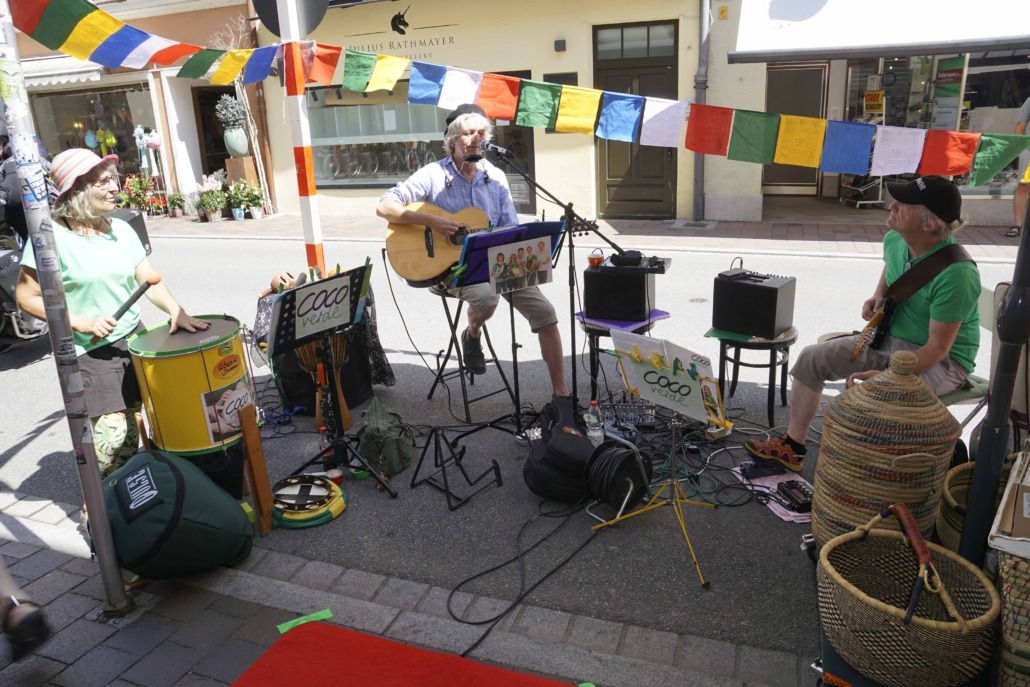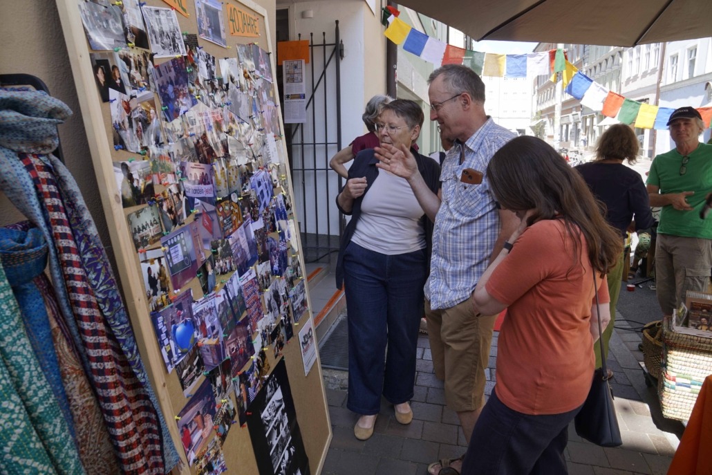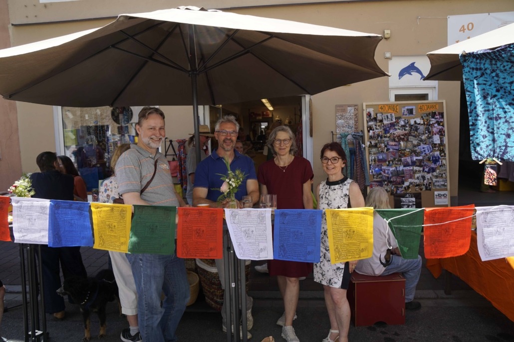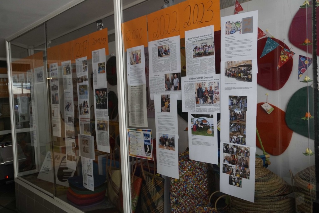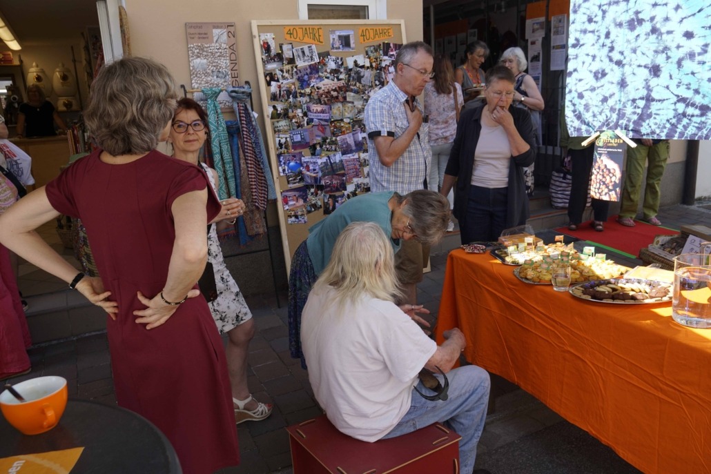 Am Samstag, 21. Juni 2025, feierte unser Arbeitskreis vor dem Weltladen sein 40-jähriges Bestehen. Das Team des Weltladens und viele aktive Mitglieder des Vereins bereiteten kulinarische Spezialitäten mit Produkten aus dem Weltladen vor. Musikalisch begleitet haben unser Fest Musiker der Gruppe COCOverde mit brasilianischer Musik. Auf einer Pinwand konnten die Besucher Szenen aus dem Vereinsleben betrachten und mancher fühlte sich in die Vergangenheit zurückversetzt. Wer tiefer in die Vereinsgeschichte eintauchen wollte, hatte die Möglichkeit, auf einem Zeitstrahl 40 Jahre Arbeit zurückzuverfolgen. Meist anhand von Zeitungsartikeln wurden die vielen Aktivitäten und Projekte dargestellt.